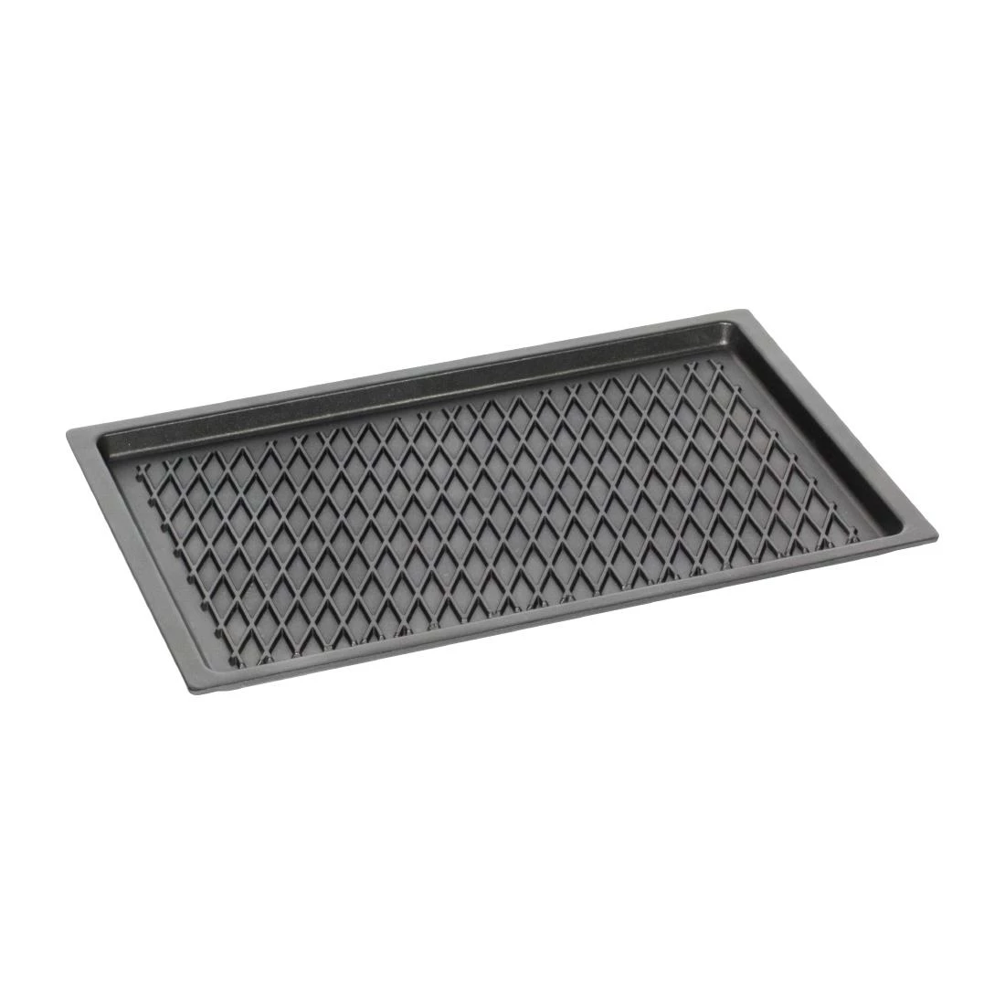 GN 1/1 with a diamond pattern for a perfectly done steak with a unique looks. Made of a casted aluminium alloy, the tray heats up faster and retains heat for longer. It does not cool down in contact with cold meat – the pores immediately close and the meat remains juicy and tender, at the same time perfectly fried. Covered with Lotan® coating, which allows frying without the use of fat, prevents food from sticking to the surface of the tray and makes it easier to clean. Can be used in oven, but also on the stove.