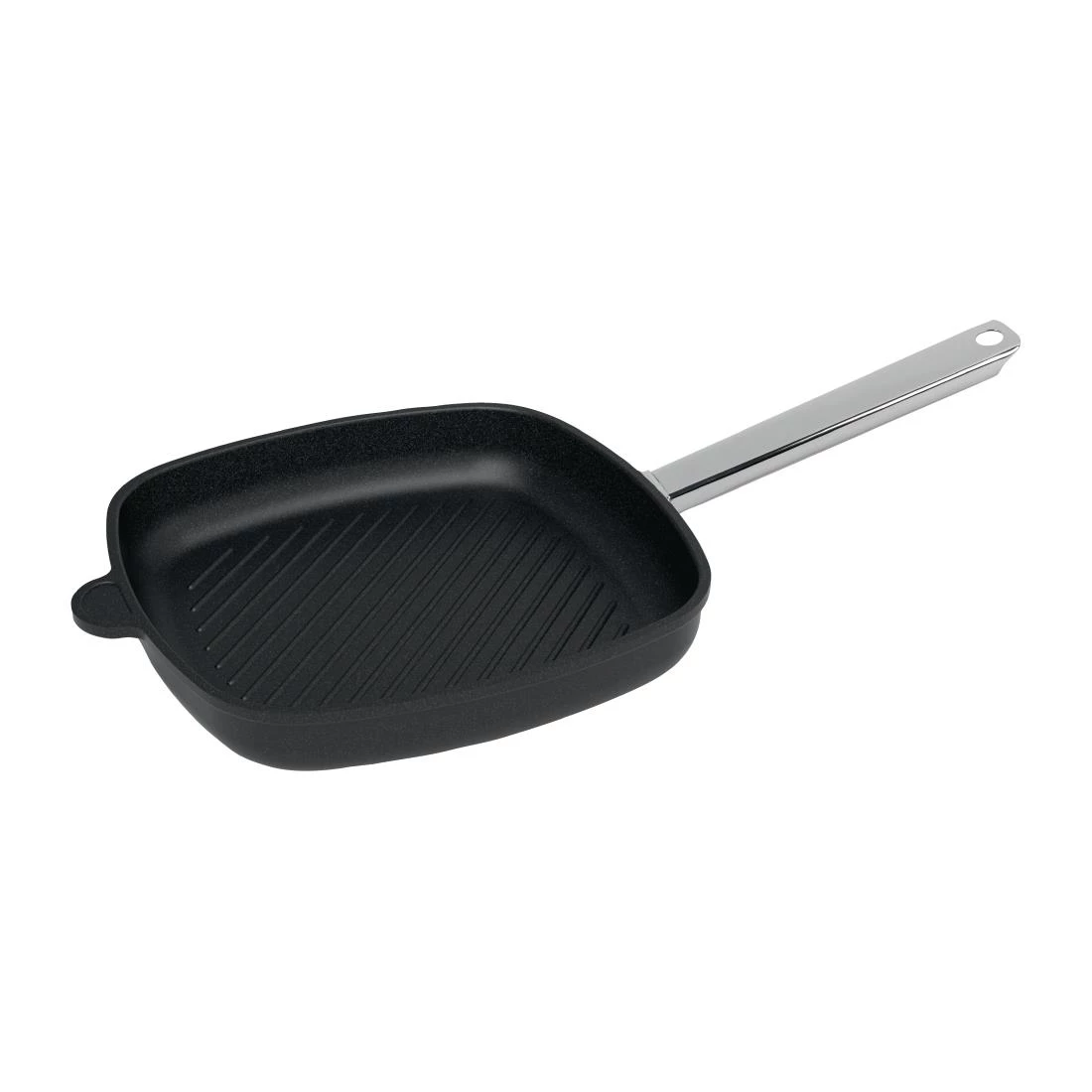 Square pan with a classic grill pattern. Made of cast aluminium, which makes pan heat up quickly and evenly – both on the bottom and on the sides of the pan. This favours the even heating of the food – the dishes are perfectly browned and crispy on the outside, and soft and juicy on the inside. Coated with Lotan® non-stick coating, that allows fry without oil or fat, prevents food sticking and reduces the risk of burning and makes cleaning the dish much easier.