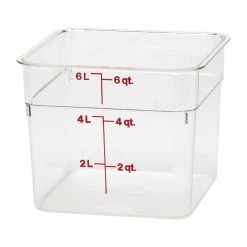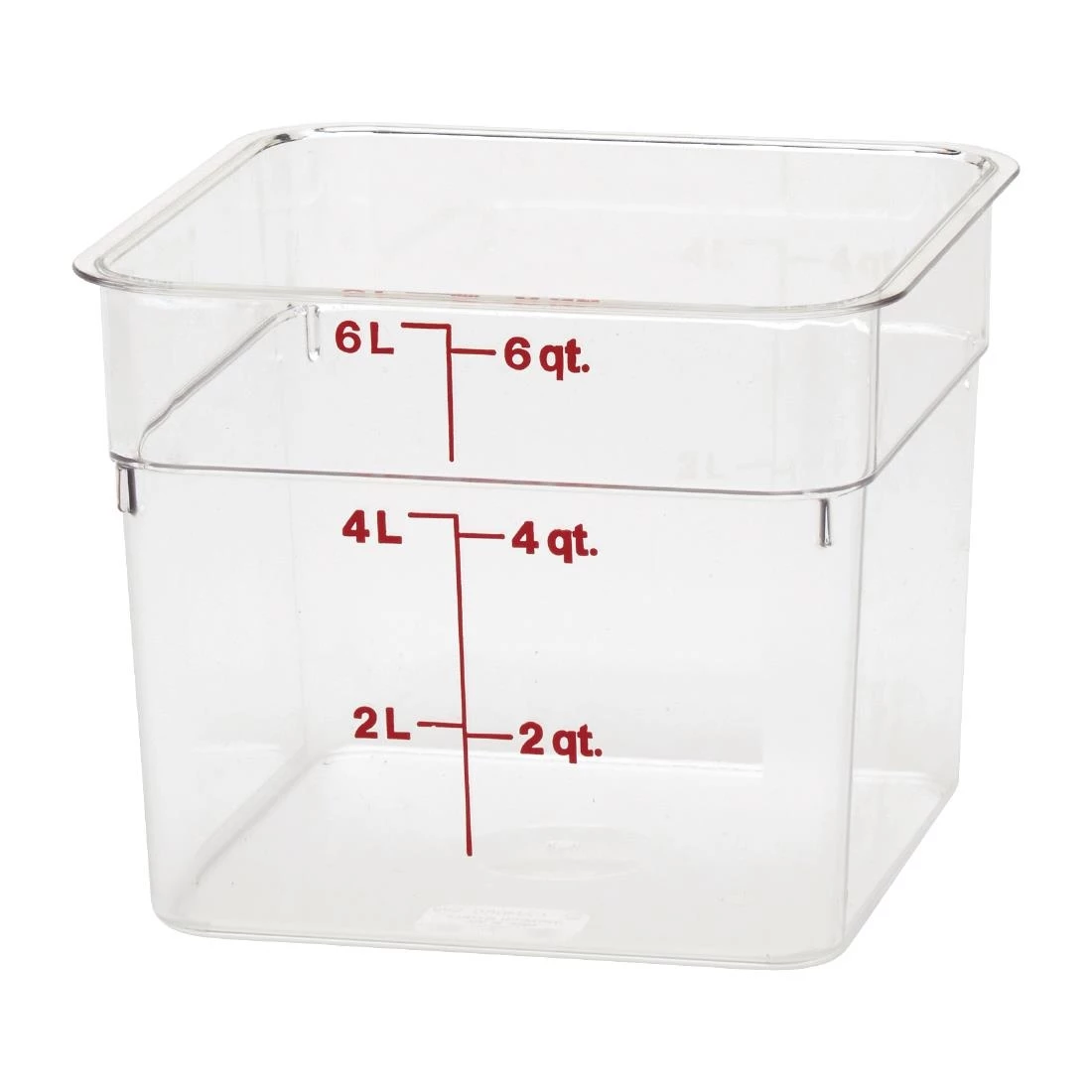 The typical pressures of a busy food service environment are no match for the robust design of this Cambro food storage container. Ideal for portioning and storing all your ingredients, toppings, and pre-prepared foods, the square polycarbonate container can be paired with a compatible lid (sold separately) to keep your foods fresh. Its crystal clear clarity lets you quickly recognize contents and minimize unnecessary openings, while a 5.7 Litre capacity provides plenty of storage space. As square containers, they also stack safely, allowing you to maximise your storage space.