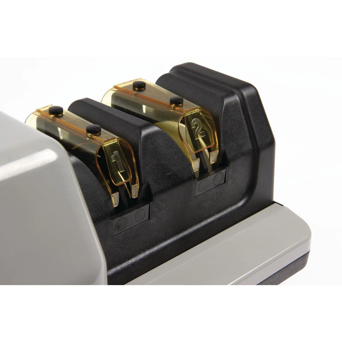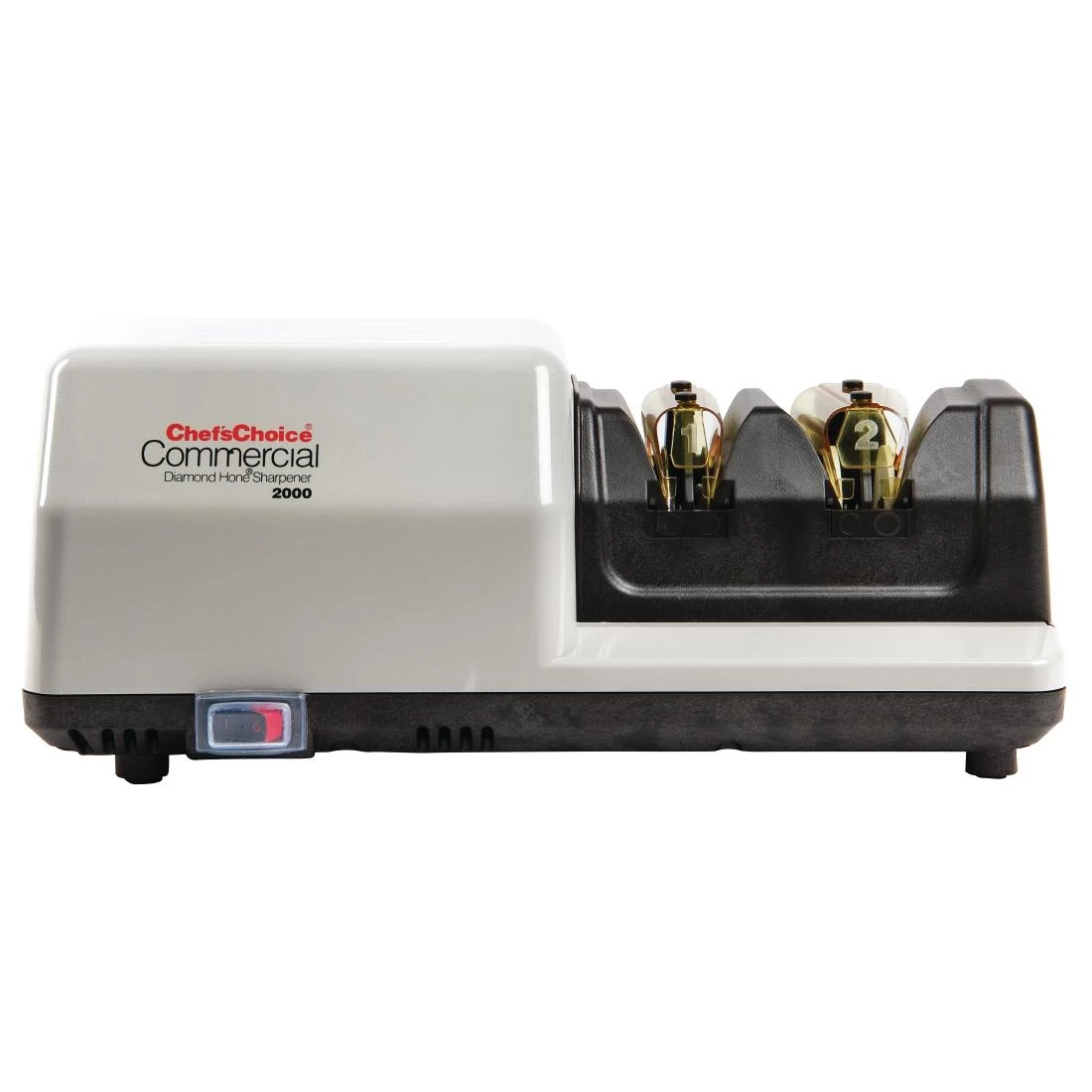 Sharpen your blades in seconds using this high-performance electric knife sharpener from Chef’s Choice. Developed specifically for use in demanding commercial kitchens, the Commercial 2000 diamond hone sharpener uses a two-stage process to create double-bevel edges that stay sharp up to three times longer.