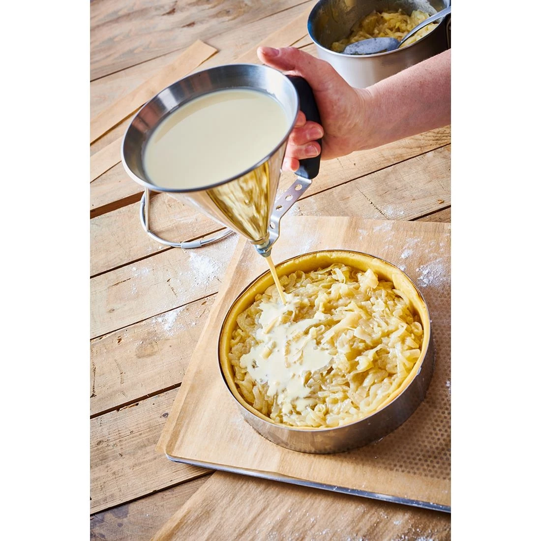 Guarantee first-class presentation with this premium De Buyer 800ml mini automatic piston funnel. Made with a 7mm nozzle and trigger-releasing design, the funnel helps you dispense equal portions of sauces or cream with expert precision, improving your presentation and helping you control portion sizes. A silicone coated, stainless steel wire stand also keeps the unit fixed in position, allowing you to apply sauces with great control. The funnel is also dishwasher-safe to allow for quick and easy cleaning.