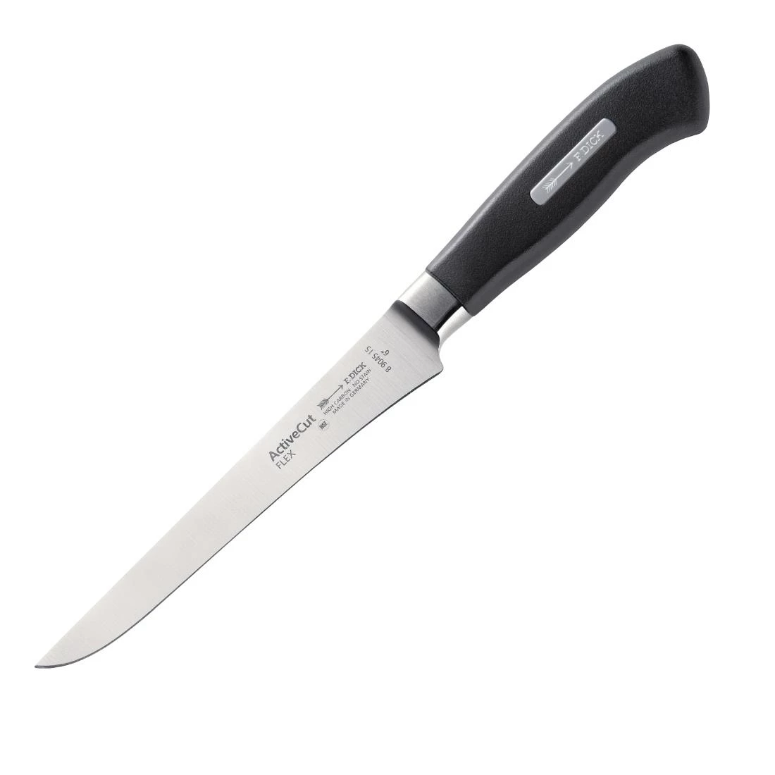 This flexible boning knife is part of the Active cut range from leading brand Dick. It features double honing to ensure extreme sharpness and its half-bolster allows you to sharpen the whole blade when required. The handle is ergonomically designed, providing you with comfort when working with large quantities. Its flexibility allows you to quickly and easily remove the bones from fish, poultry and other meats.