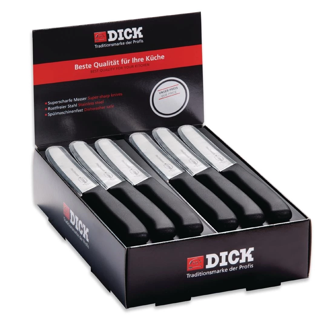 These premium quality German utility knives are made from stainless steel and are perfect for use in any kitchen for a multitude for cutting tasks. The plastic handle is hygienic and easy to clean after use. This sales box is perfect for sales purposes, to display these knives on a countertop.