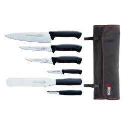Superior quality German-made knives constructed with expert craftsmanship. Our Pro Dynamic knife set is supplied with a ‘Dick’ branded wallet. The set contains an 8½” Chef’s Knife (GD773), Flexible Fillet Knife 7″ (GD777), (GD782) Palette Knife 9″, (GD771) Boning Knife 5″, (GD769) Parer 3″, Peeler (GL297), (GD795) Roll Bag.