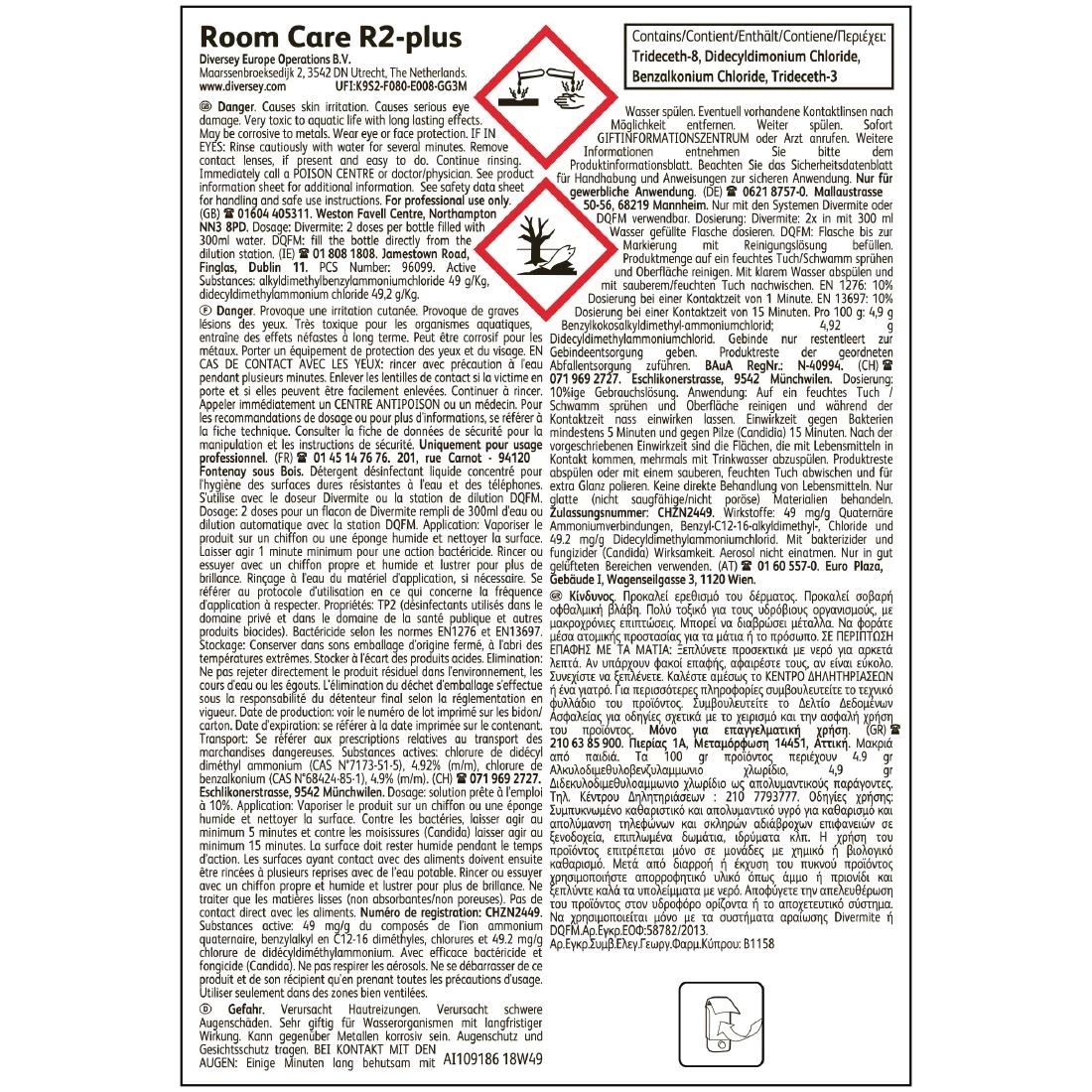 Keep the surfaces in your guestrooms and washrooms exceptionally clean with these Diversey Room Care R2-plus multi-surface cleaner and disinfectant concentrate pouches. Formulated to deliver professional results, this chemical will quickly remove dirt, grime, grease and bacteria on your surfaces. This will help you to hold your washrooms and guestrooms to the highest possible standards of hygiene and cleanliness.