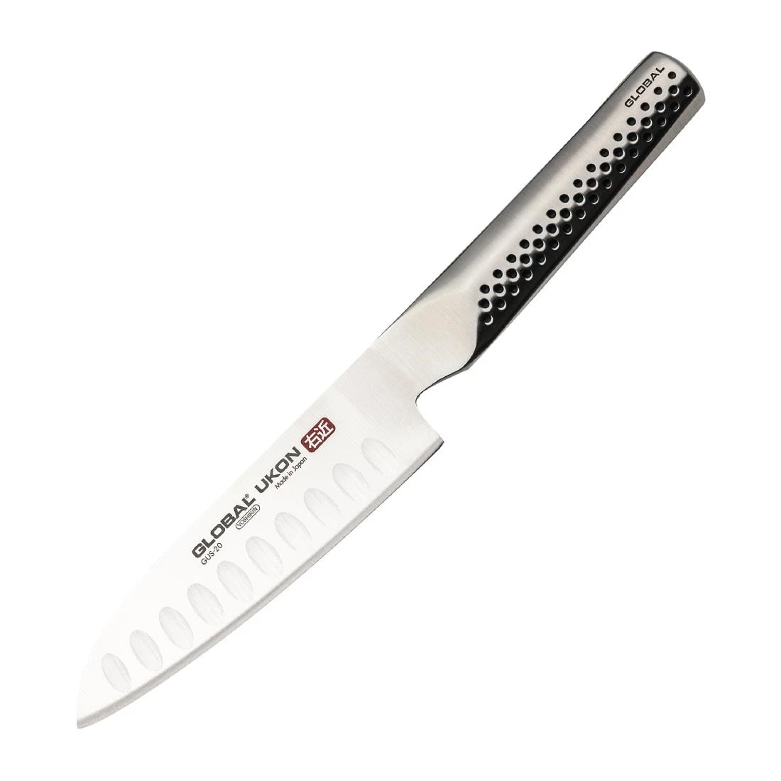 The name ¿UKON¿ has many positive connotations in Japanese legend, and in true GLOBAL tradition, the GLOBAL UKON series is constructed from the finest CROMOVA 18 Stainless Steel material and features thicker blades to enhance performance. The Global Ukon GUS-20 Small Santoku Knife is a great all-round knife and one of its key features is the indentations on the cutting edge. These small divets create little air pockets between the blade and your ingredients, to prevent slices from sticking as you cut. The GUS-20 is excellent for prepping medium vegetables, meat and fish.