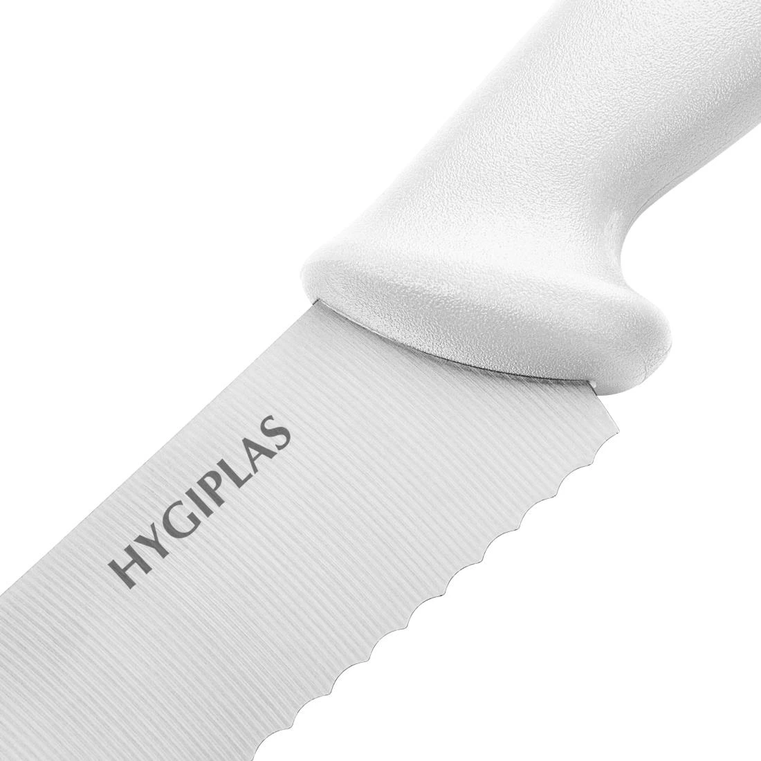 This serrated slicer knife by Hygiplas has a blade which is made from the finest stainless steel and also features a colour coded dishwasher proof handle. This knife has a white handle which means it’s suitable for cutting bakery and dairy products.