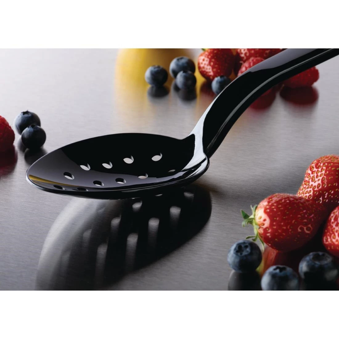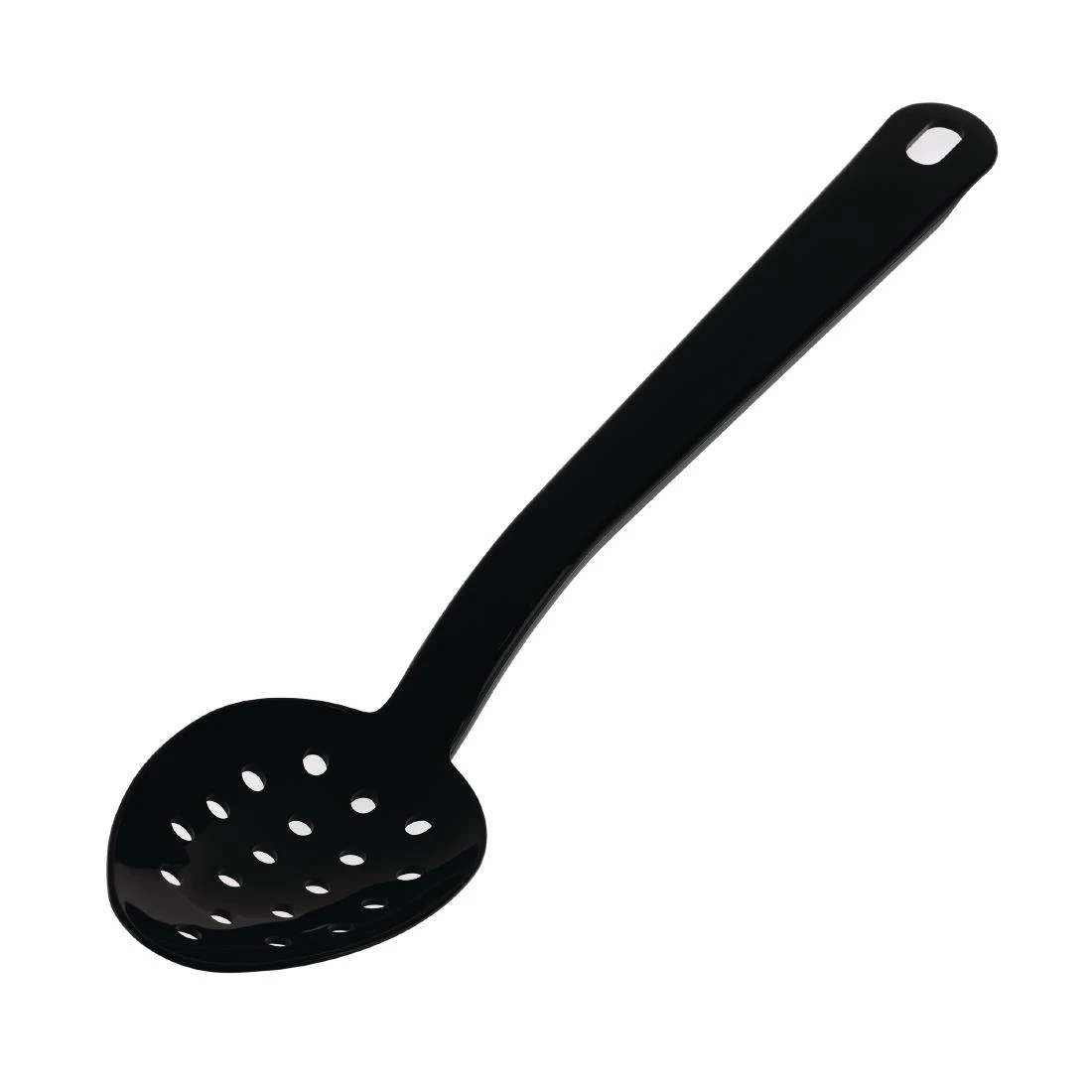 Incredibly versatile, the Matfer Bourgeat exoglass perforated serving spoon is ideal for cooking and serving any kind of food. Constructed from heat resistant exoglass, the spoon is able to withstand temperatures up to 220°C (428°F), making it perfect for use when serving hot ingredients. Made with a perforated head, the spoon quickly drains away any excess liquids, making it easy for you to plate vegetables and other boiled food. A useful hole in the handle also allows the utensil to be easily stored for quick access when serving. Incredibly robust and durable, the spoon is able to withstand the rigours of any busy commercial kitchen.