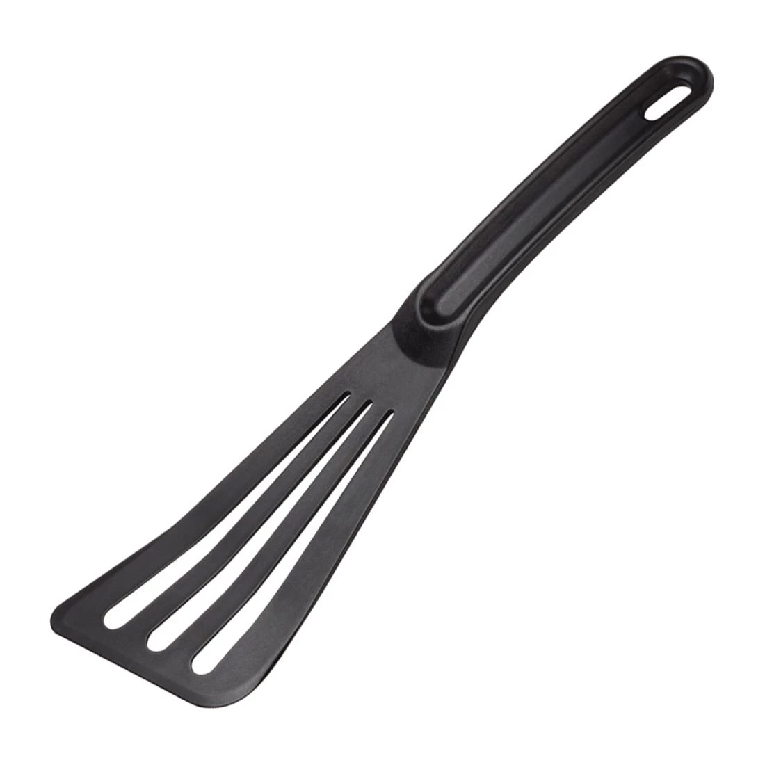 Ensure effective and hygienic preparation with this Hells Tools 12″ slotted spatula from Mercer Culinary. Constructed from extremely strong and durable glass-reinforced nylon, the spatula is heat resistant up to 220°C (430°F), making it ideal for use in busy commercial kitchens. A slotted head allows unwanted liquids to drain back onto the pan and not customers’ plates, ensuring you serve impeccably presented meals every time. A stain and odour resistant, one-piece construction also makes the spatula easy-to-clean, helping you maintain a hygienic kitchen at all times. This black spatula has been NSF approved and is HACCP compliant.
