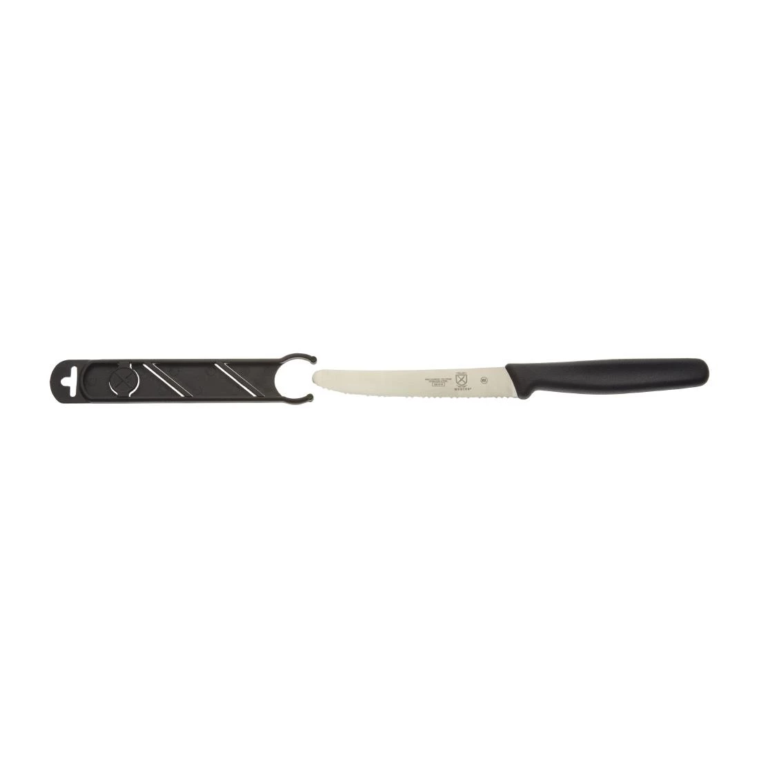 Use this Mercer Culinary M33932B 4 1/4″ serrated rounded tip paring / bar knife with guard to create the perfect garnish for your crafted cocktail. The perfect addition to any mixologist’s toolbox, this knife is designed to effortlessly cut fruits, herbs, and vegetables for garnishing a Bloody Mary, Moscow mule, daiquiri, or your signature drink. Its rounded tip protects soft insides while the serrated edge easily cuts through tough skins. Use it in your restaurant to cut apples or oranges, or in advance of catered events to prepare strawberries or lemon wedges.