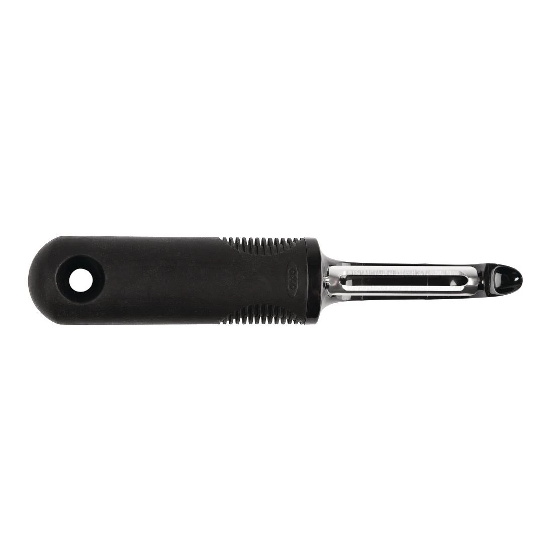 Reduce wastage and peel efficiently with the OXO Good Grip Swivel peeler. Boasting an innovative swivel design, the utensil is able to perfectly follow the shape of the vegetable, removing less flesh and peeling faster for more efficient performance. Made with a pressure-relieving, anti-slip handle, the utensil is also extremely ergonomic in the hand, allowing you to comfortably peel large quantities of ingredients. Incredibly reliable, functional and affordable, the peeler is perfect for coping with the demands of any busy commercial kitchen.