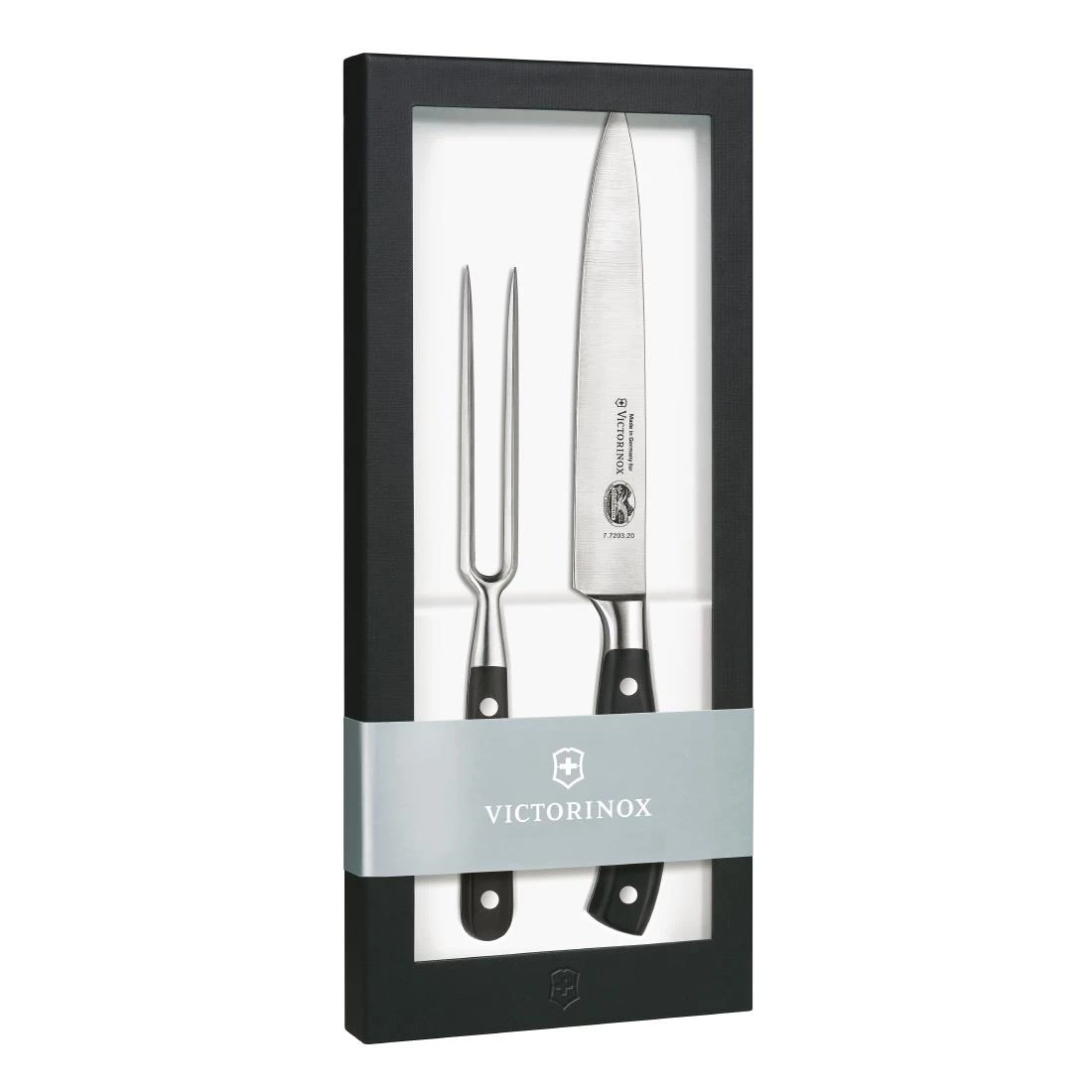 Carve with confidence, with this 2-piece carving set from Victorinox. The set includes a carving knife and fork that are expertly designed for effortless slicing through a variety of meat joints. The knife is constructed with a 8″ blade that is ideal for finely slicing through the toughest of foods, whilst the 6″ carving fork is made to hold meat joints in-place for accurate cutting.