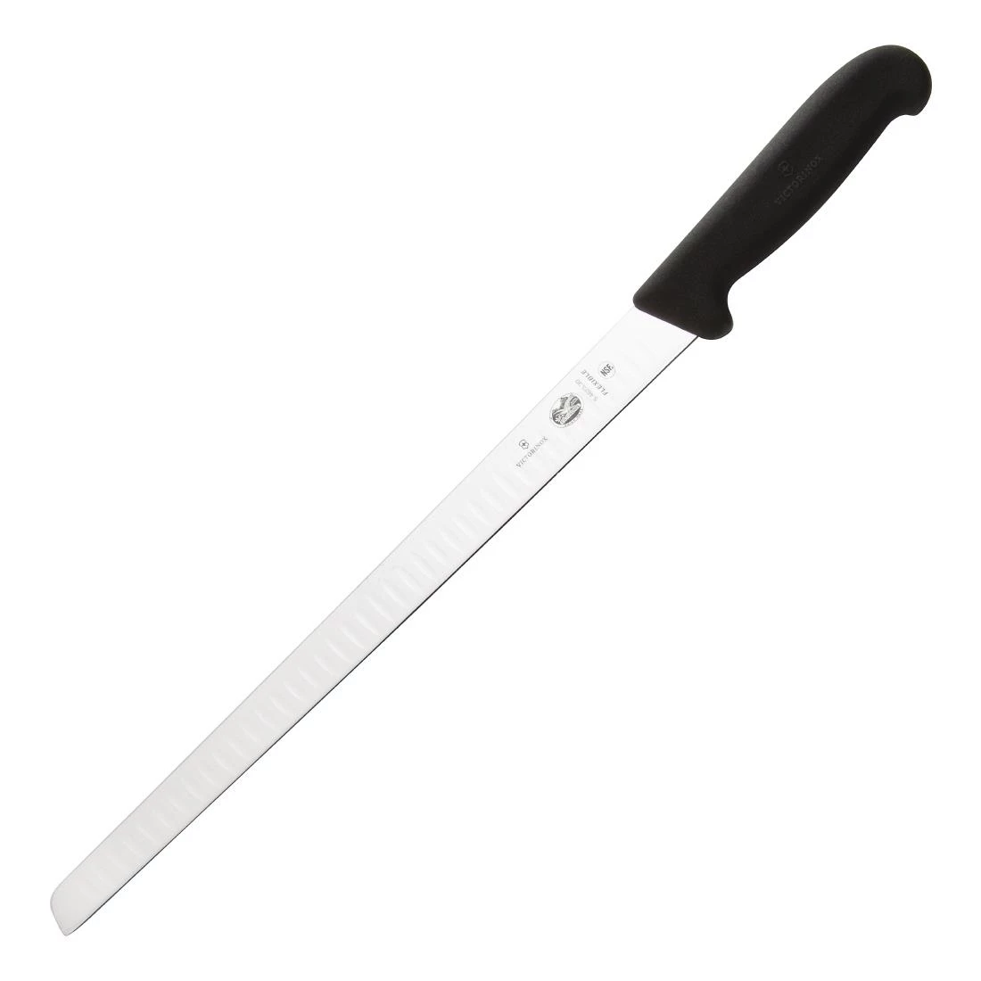 Finest quality Swiss professional knives, the result of over 100 years experience. This Victorinox salmon knife has a high quality razor sharp stainless steel scalloped blade with a unique anti-slip nylon Fibrox handle. It is dishwasher safe.