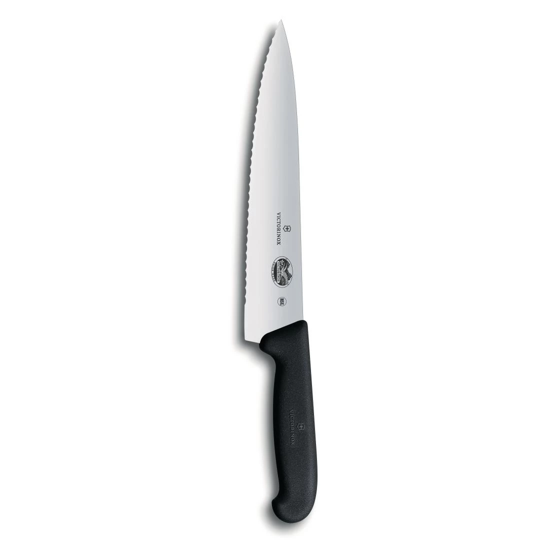 Finest quality Swiss professional knives, the result of over 100 years experience. This Victorinox chefs knife has a high quality razor sharp stainless steel serrated blade with a unique anti-slip nylon Fibrox handle. It is dishwasher safe.