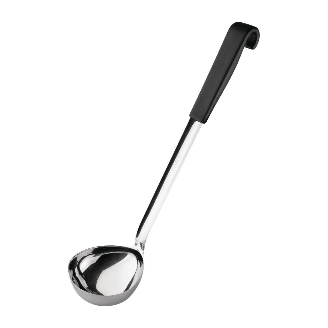 Serve portion after portion of sides, soups and sauce in comfort with this Vogue ladle thanks to its comfortable vinyl handle. A strong stainless steel construction also makes it highly durable and suitable for use all day in a busy food service environment. As this utensil is dishwasher safe, cleaning is also simple which ensures best hygiene practise can be observed.