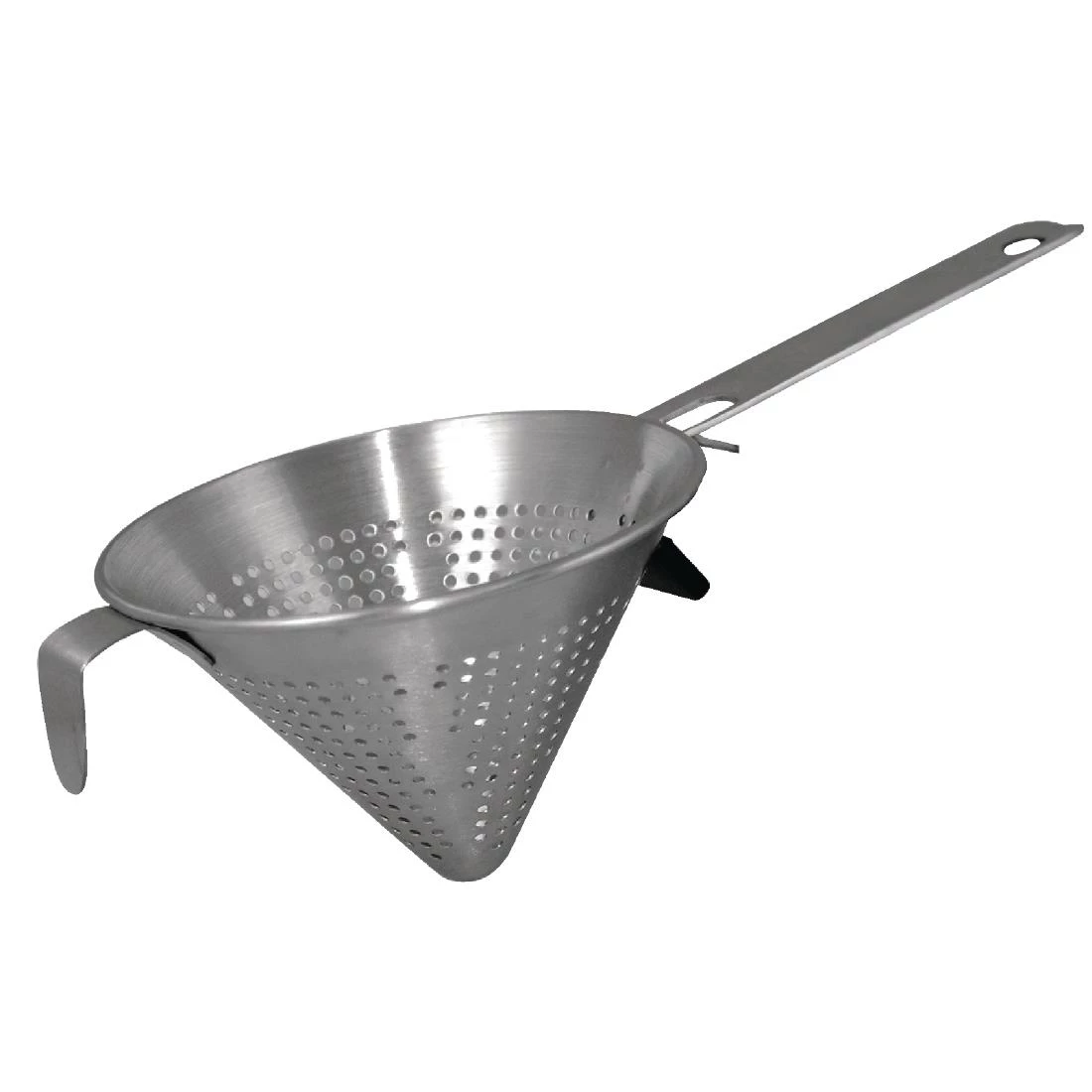 Create perfectly prepared soups, sauces and broths with the Vogue 9″ conical strainer. Crafted from robust stainless steel, the strainer is immensely hardwearing and long-lasting, allowing it to cope with rigorous use in any fast-paced commercial kitchen. Made with a long handle, the utensil is incredibly easy-to-use, giving you complete control when straining. Made with a convenient hook, the strainer can also be held in place when being used with pots and pans, giving you a free hand for other tasks. A useful hole in the handle also allows for easy storage and quick access during busy services.
