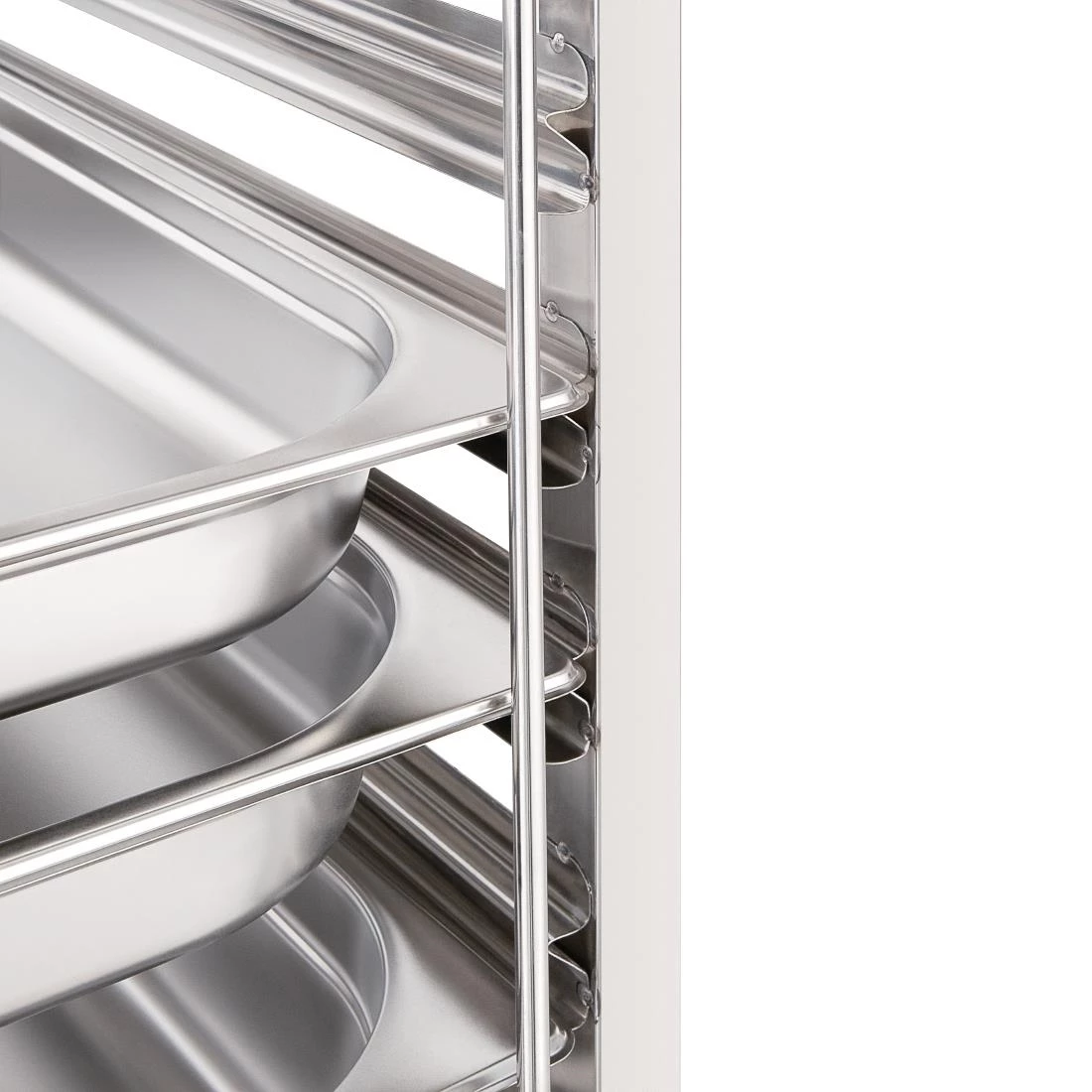 - Seven shelves designed to hold 1/1 GN gastronorm pans securely