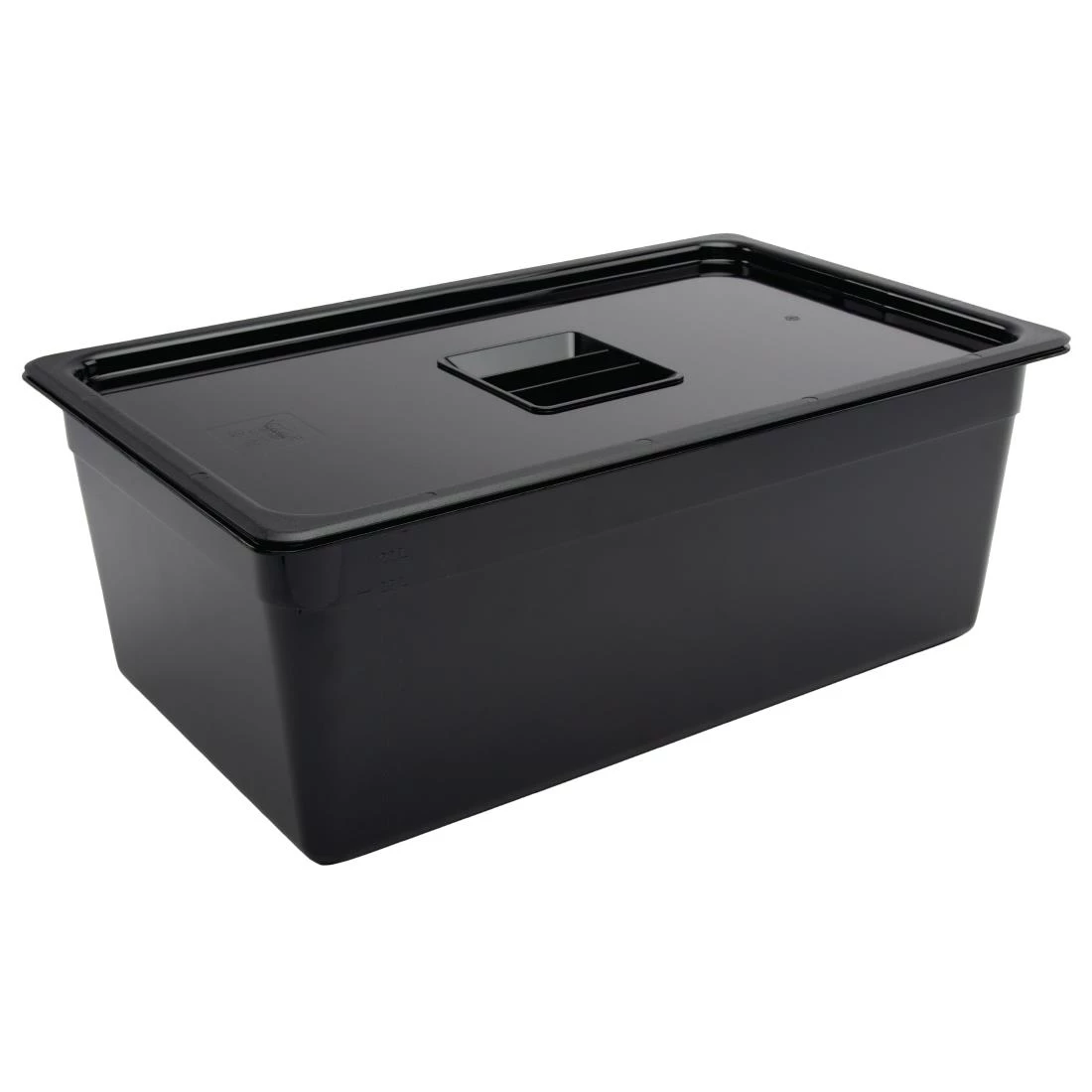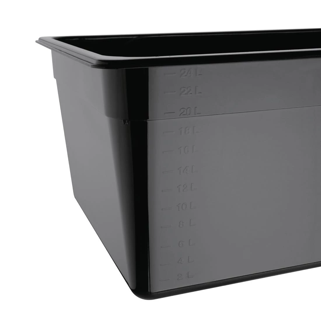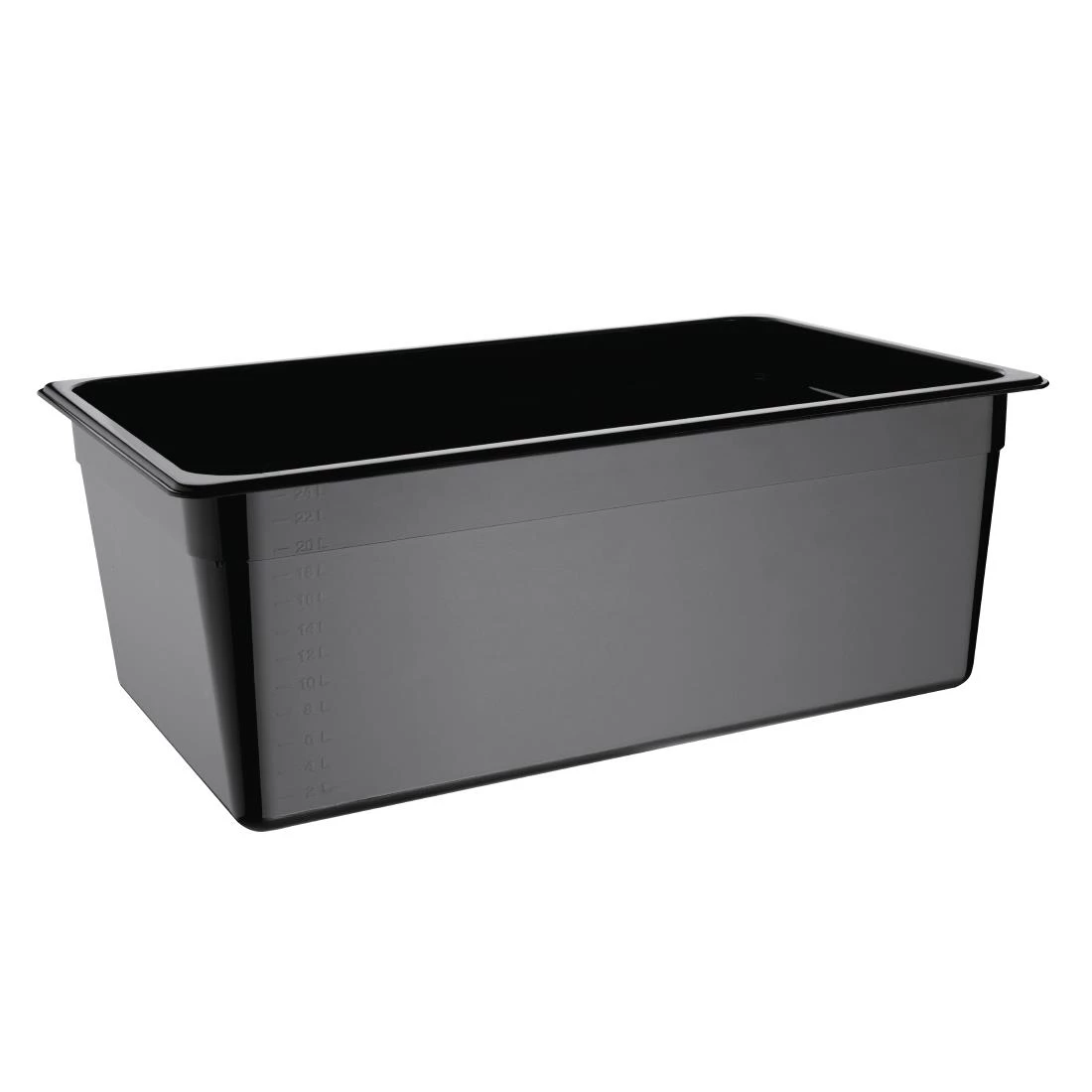 Store your food with this Vogue polycarbonate 1/1 gastronorm container in black (200mm/25.6Ltr).
