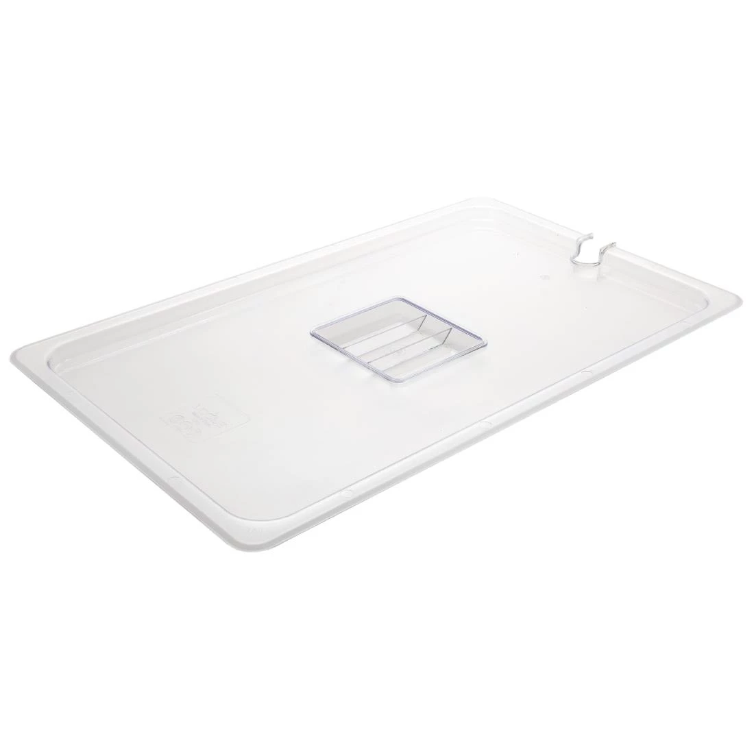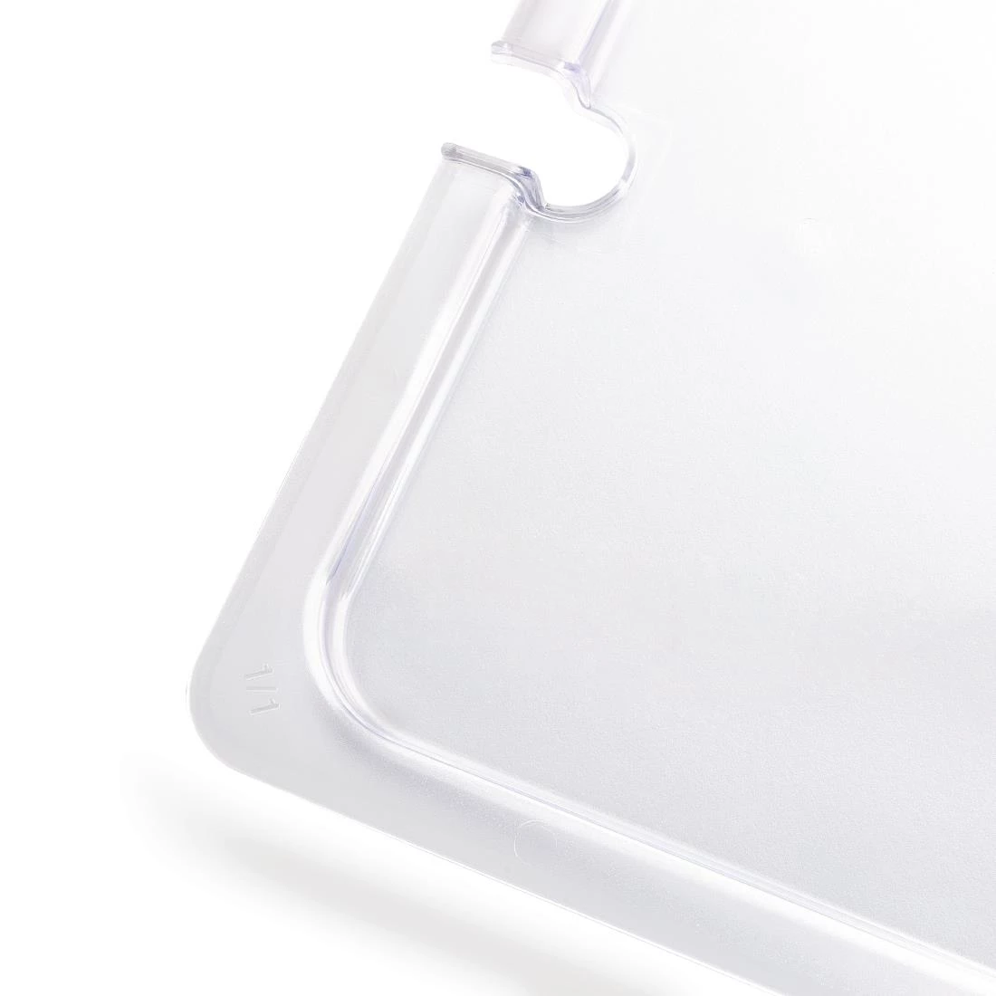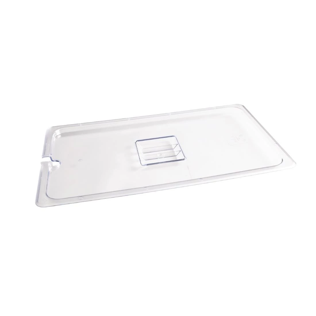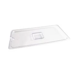 This lid covers 1/1 size Vogue gastronorm containers, keeping food warmer for longer and safe from contamination. Constructed from strong polycarbonate plastic, the lid is very robust and durable and capable of standing up to your kitchen’s demands. Featuring a notch on the side, this allows for a serving utensil to sit inside the gastronorm and poke outside, saving you time when you need to find one quickly.