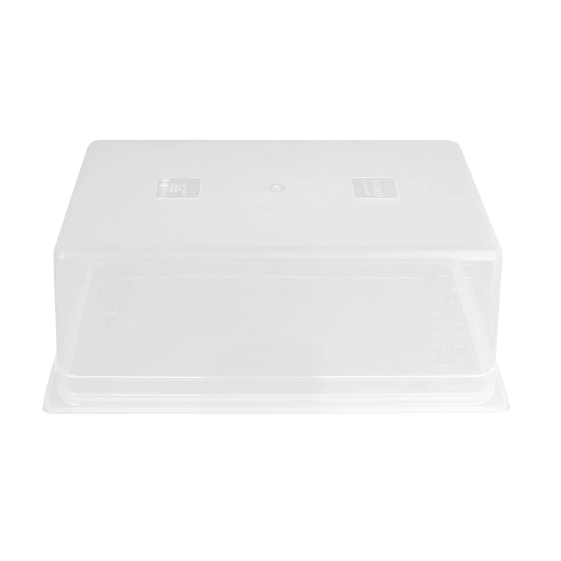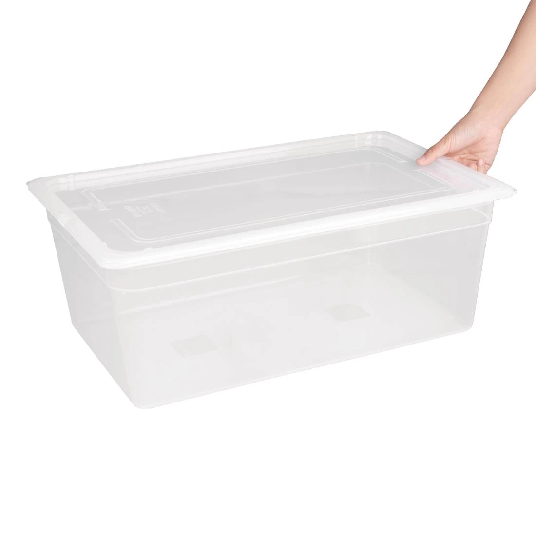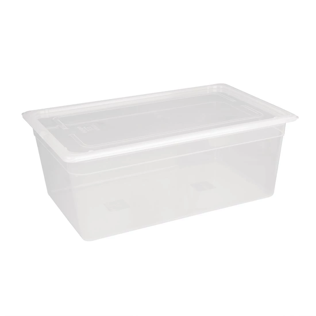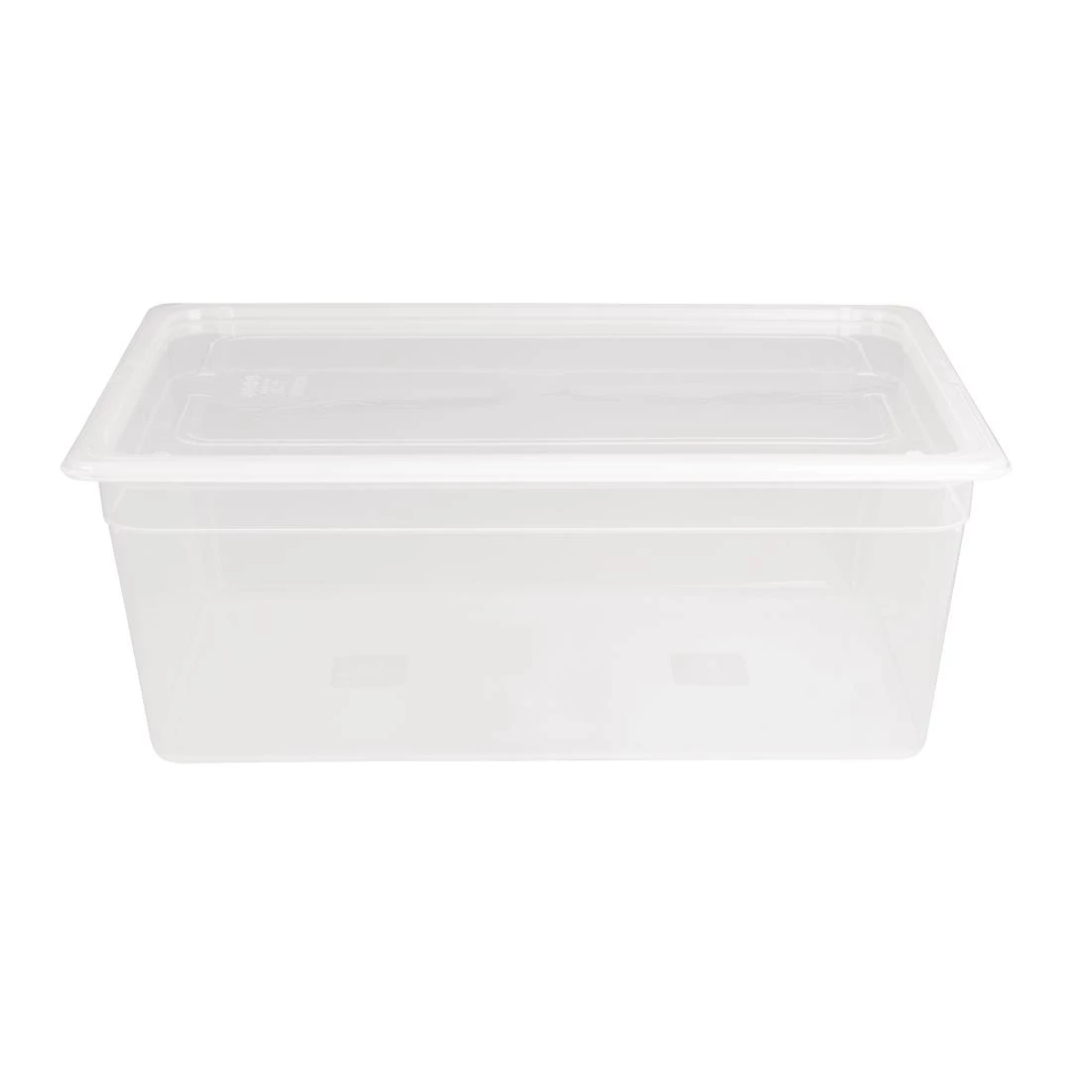 The Vogue polypropylene 1/1 gastronorm container with lid (200mm/25.6 litre) is an ideal high capacity solution for safely storing large quantities of food.