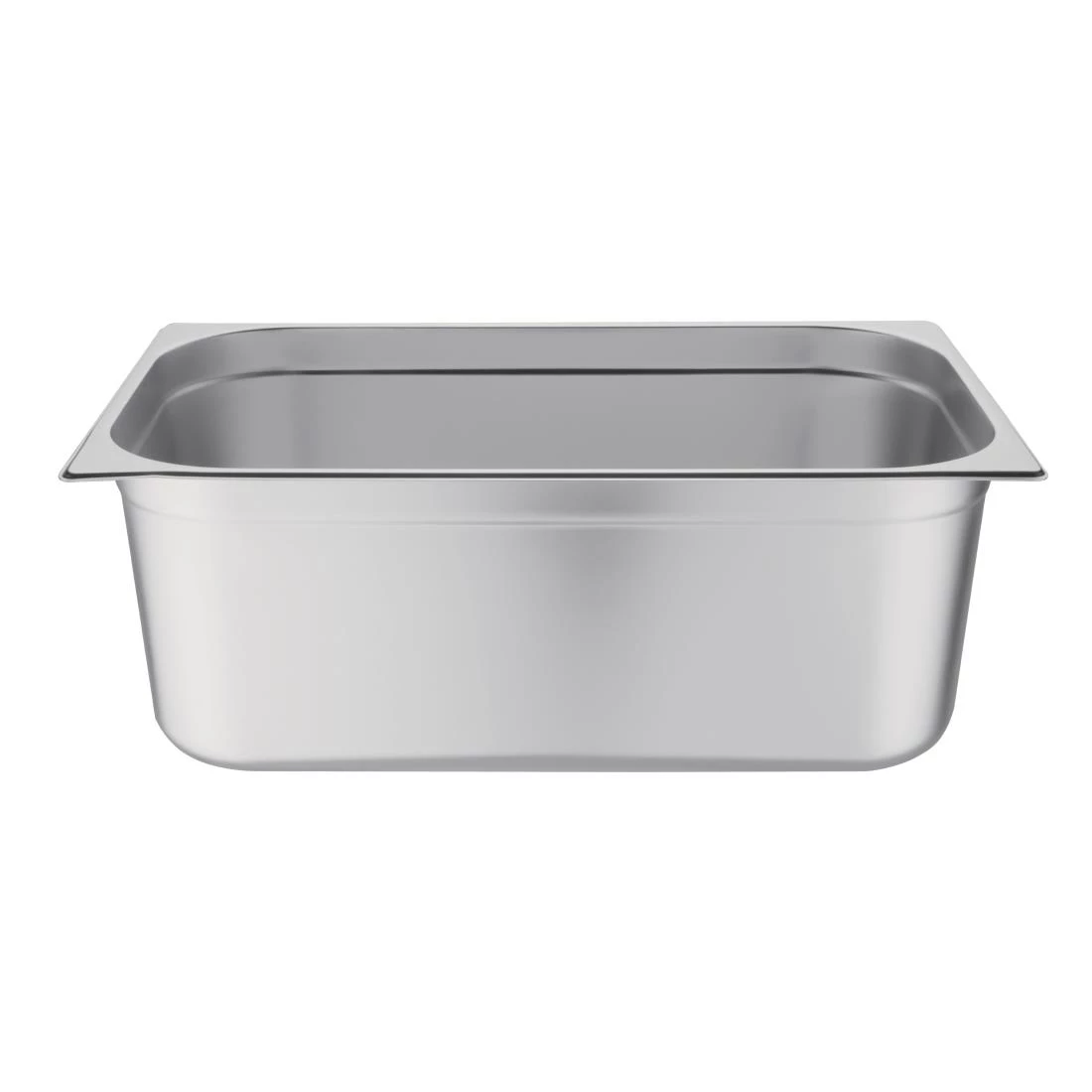 The Vogue stainless steel 1/1 gastronorm pan (200mm/28 litre) is the ideal gastronorm pan for safely storing or presenting large quantities of food.
