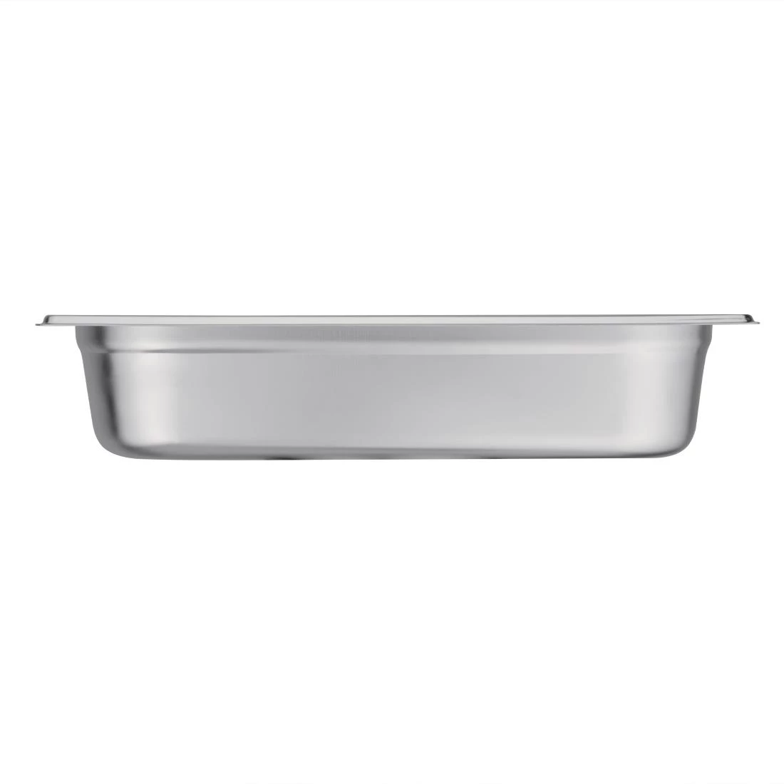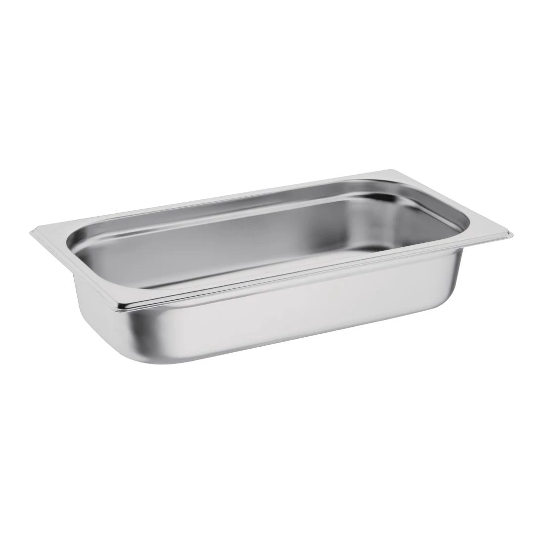 This Vogue stainless steel 1/3 gastronorm pan is on the smaller end of the gastronorm pan spectrum, but has a decent capacity. Its 2.5 litre capacity allows it to store decent amounts of food or sauces for preparation or serving at front of house buffet stations.