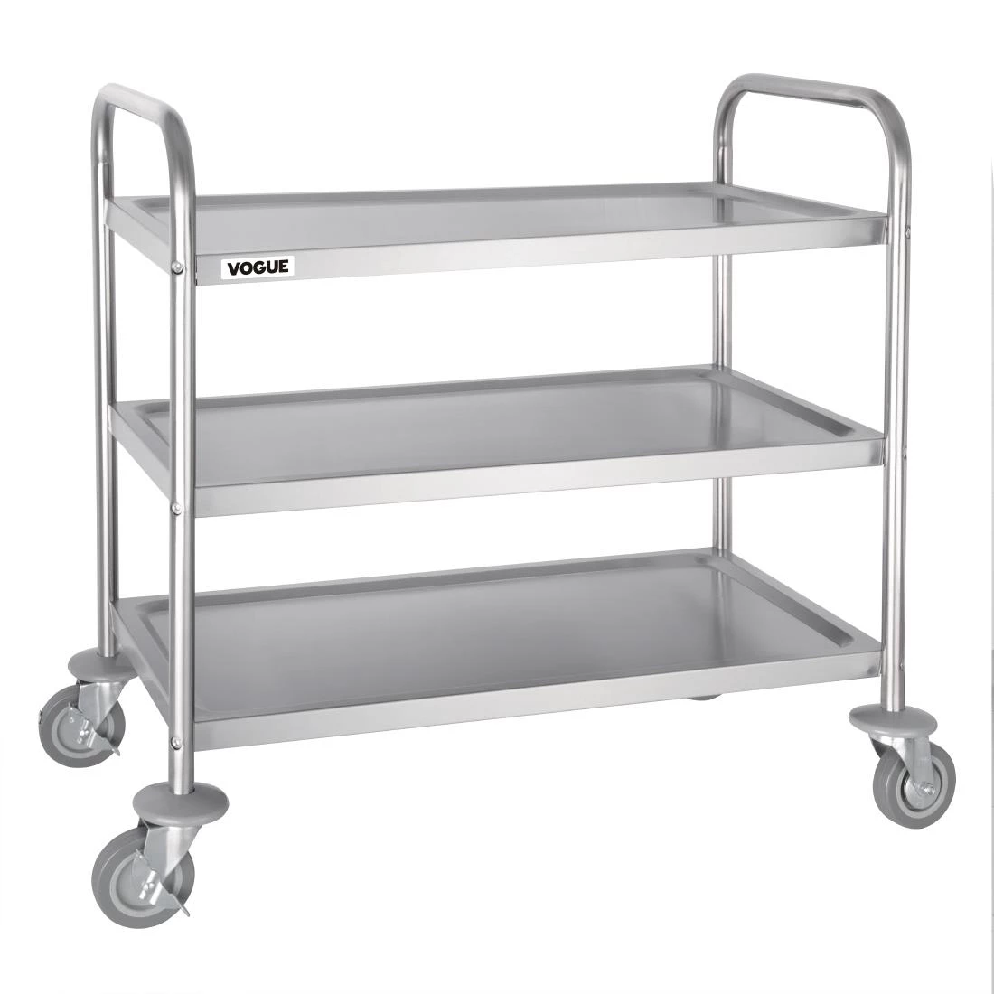 Strong and durable, the medium size three tier Vogue clearing trolley is a great solution for transporting items between areas. Constructed from stainless steel throughout, the trolley is both easy to clean and maintain and provides a hygienic base to transport items, whether that’s utensils, plated meals, drinks dispensers, linen or cleaning materials.