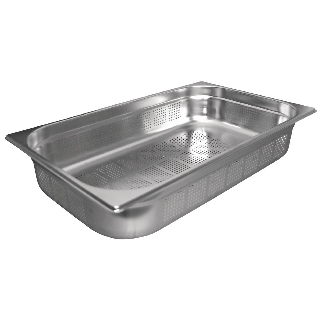 The Vogue stainless steel 1/1 perforated gastronorm pan (65mm/9 litre) is a versatile gastronorm pan for both cooking and storage.