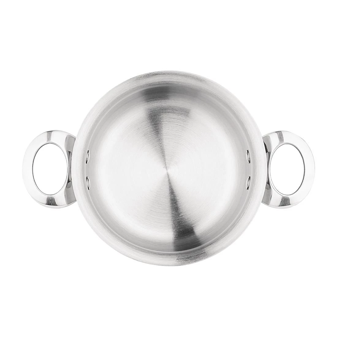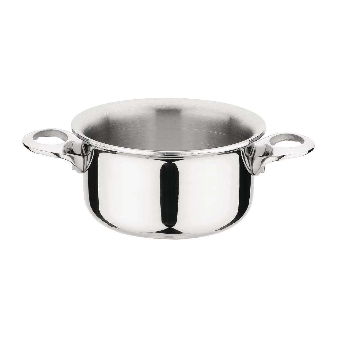 Part of the premium range from trusted brand Vogue, this innovative pot features an aluminium thermocore that has been sandwiched between stainless steel walls to provide even heat distribution without hotspots for great performance. It has a hardwearing mirror polished exterior with brushed finish interior. 100mm(W)X100mm(D)X58mm(H) with a capacity of 0.44L.