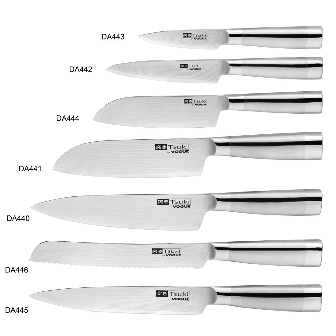 Effortlessly slice through bread with this 8 inch bread knife from Vogue Tsuki. The knife is made with a Japanese VG-10 stainless steel core and two outer layers of Damascus steel, making it extremely sharp and durable. The knife is also comfortable to hold, thanks to a machined grip and well balanced design.