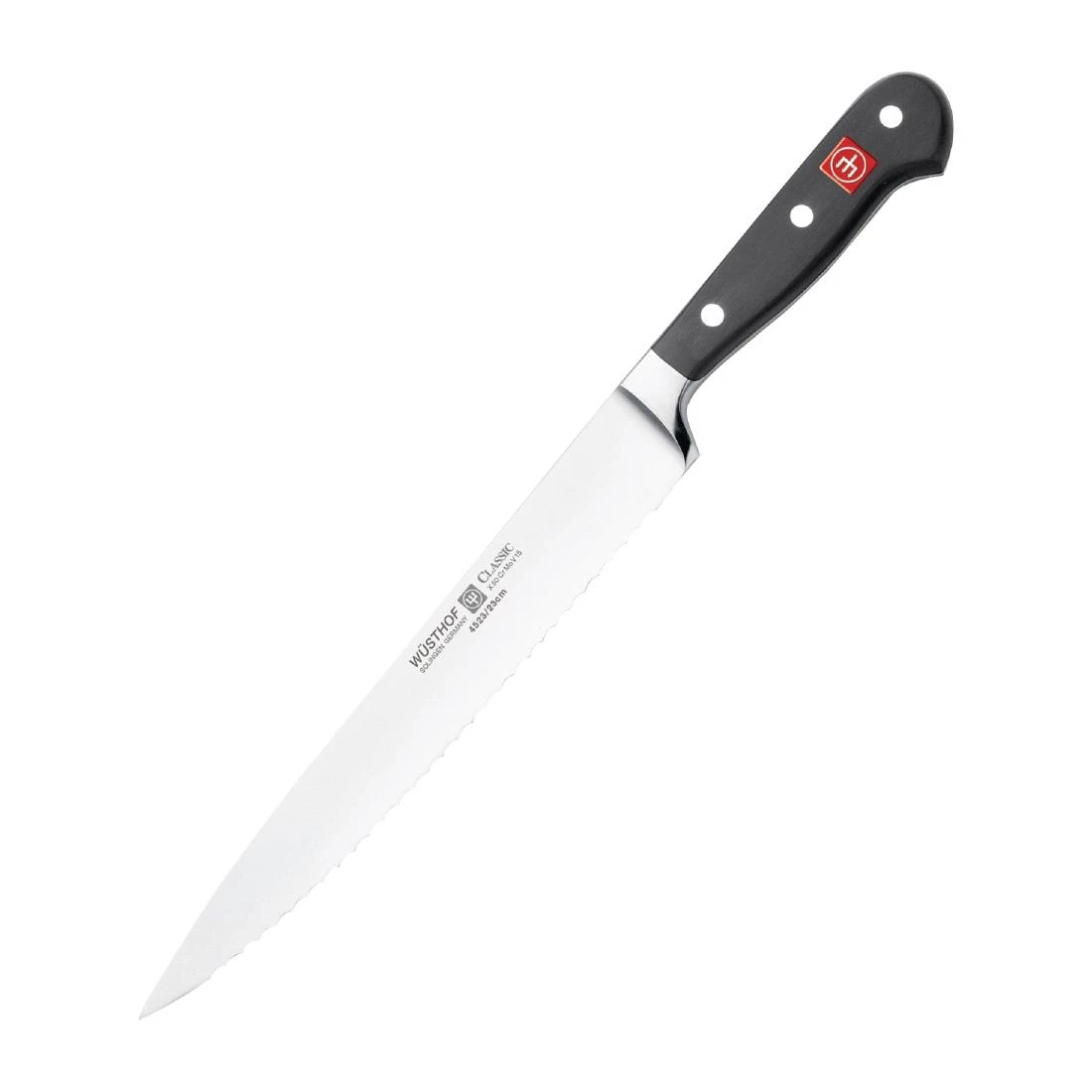Wusthof knives are often rated amongst the best in the world by many top chefs. Forged from one solid piece of high carbon stainless steel, this five piece knife set includes: 23cm (9″) carving knife, 27cm (10.5″) cooks knife, 15cm (6″) fillet knife, 6cm (2.5″) turning knife, 9cm (3.5″) paring knife and 30cm (12″) sharpening steel. The set also includes a handy roll up nylon wallet to protect and help you transport your knives safely. All these knives have been carefully chosen to be a valuable asset to any professional chef.